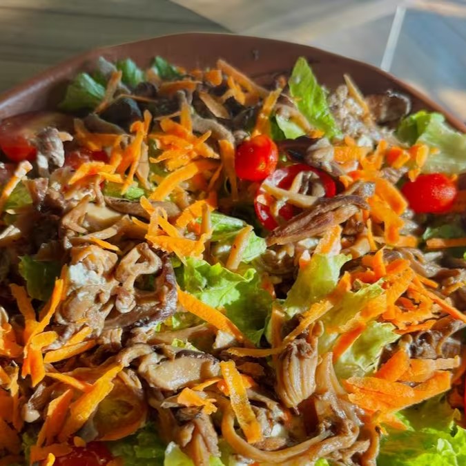 Mix de cogumelos com folhas frescas, tomate, cenoura, cream cheese, limão e azeite. Leve, refrescante e cheia de sabor natural. Ideal para uma refeição equilibrada. Peça já!