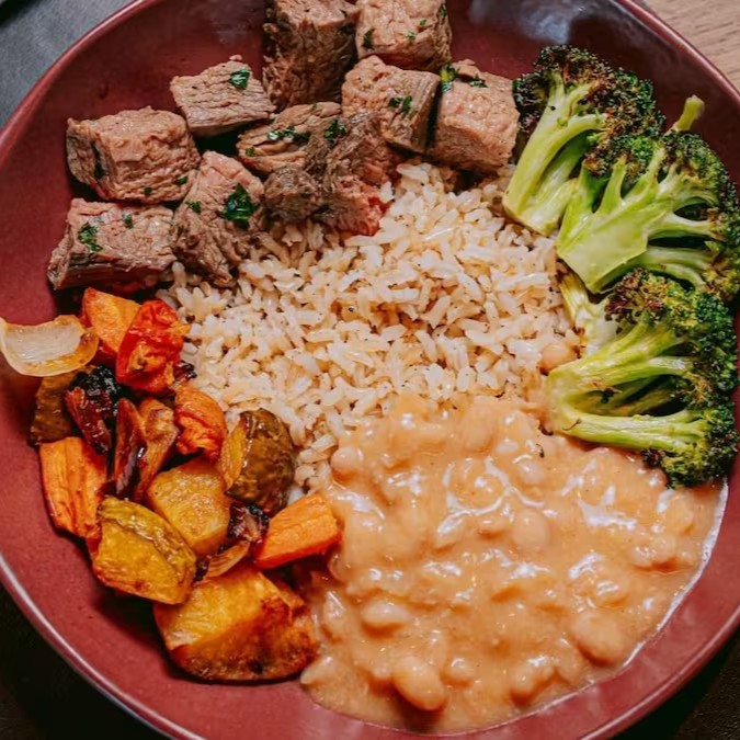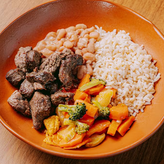 Cubos de carne macia com arroz integral, feijão carioquinha e mix de legumes assados. Refeição equilibrada e nutritiva com sabor caseiro. Ideal para o Dia a Dia. Peça já!