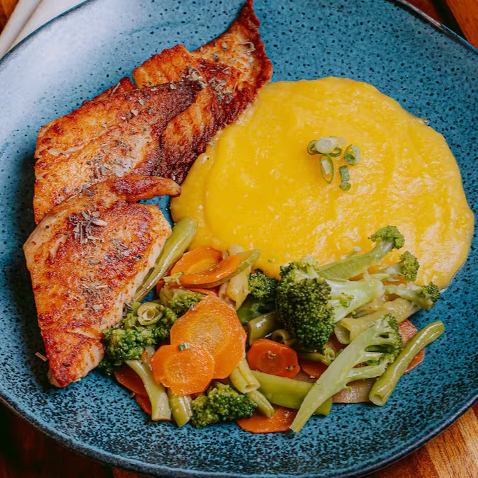 Tilápia grelhada com purê de batata e legumes assados (Abobrinha, Cenoura, Brócolis e Vagem). Rica em ômega-3, potássio e fibras, ajuda a reduzir inflamações e promove saciedade leve.