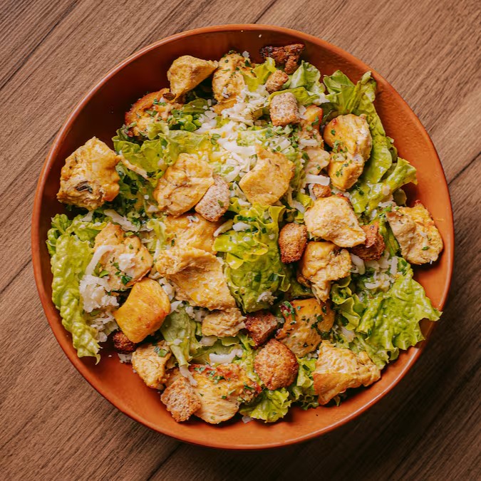 Alface americana fresca, com frango em cubos grelhado, bacon e parmesão, para completar, salsinha, croutons e molho caesar. Fonte de proteína, cálcio e vitaminas que sustentam com leveza e equilíbrio no Dia a Dia.