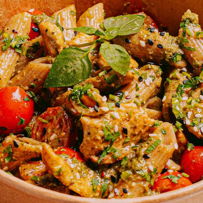 Penne com frango, tomate cereja, molho pesto e mix de queijos. Fonte de proteína, licopeno e gorduras boas que nutrem, protegem as células e trazem leveza ao prato.