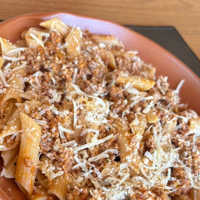 Penne servido com molho bolonhesa encorpado e mix de queijos derretidos. Massa saborosa e reconfortante para qualquer ocasião. Experimente agora!