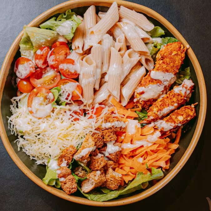 Frango crispy com penne e alface fresca, completando com tomate cereja, cenoura, croutons, parmesão e molho caeser. Uma salada completa com proteínas, fibras e antioxidantes que nutrem sem abrir mão do sabor.