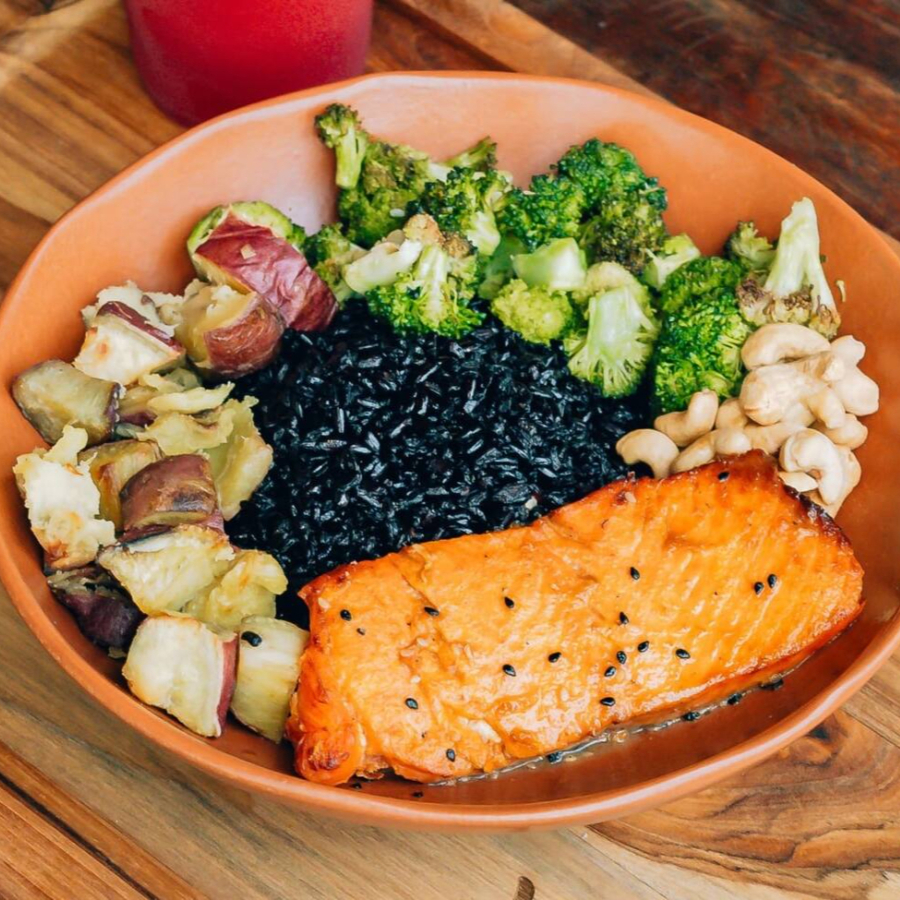 Posta de salmão, arroz negro, brócolis, batata doce, castanha e molho mostarda e mel