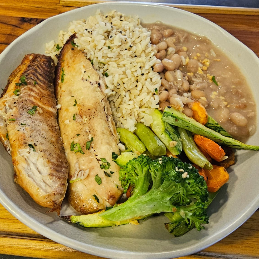 Tilápia grelhada, arroz integral, feijão, legumes assados.