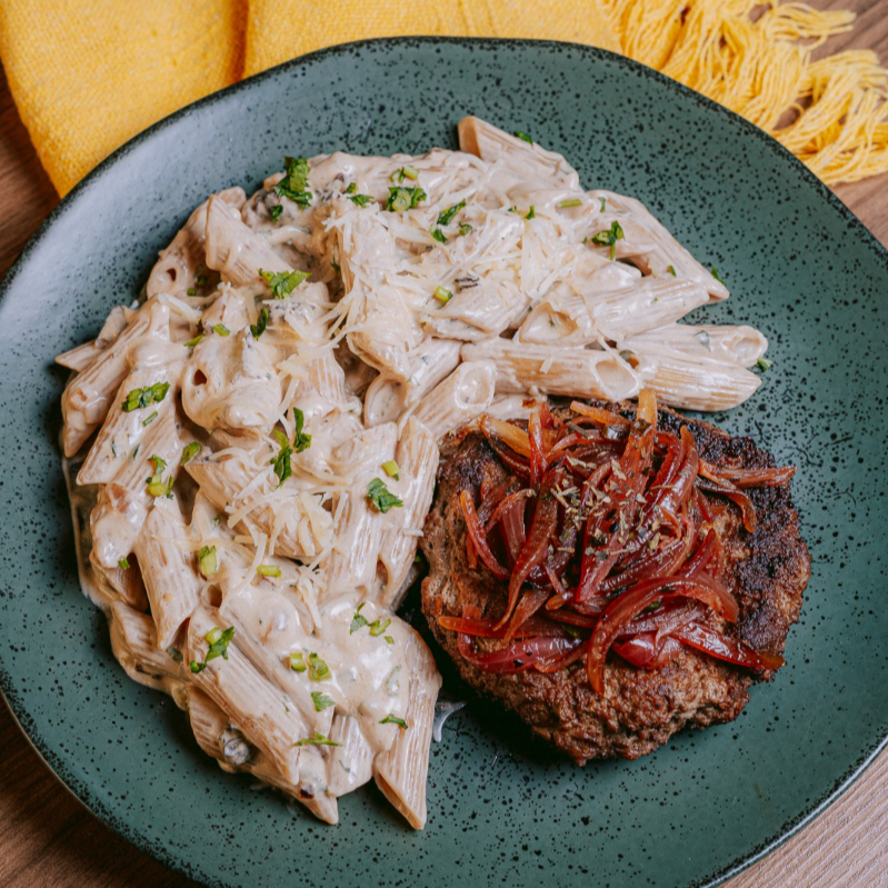 Hamburguer artesanal de fraldinha com penne ao molho funghi e cebola caramelizada
