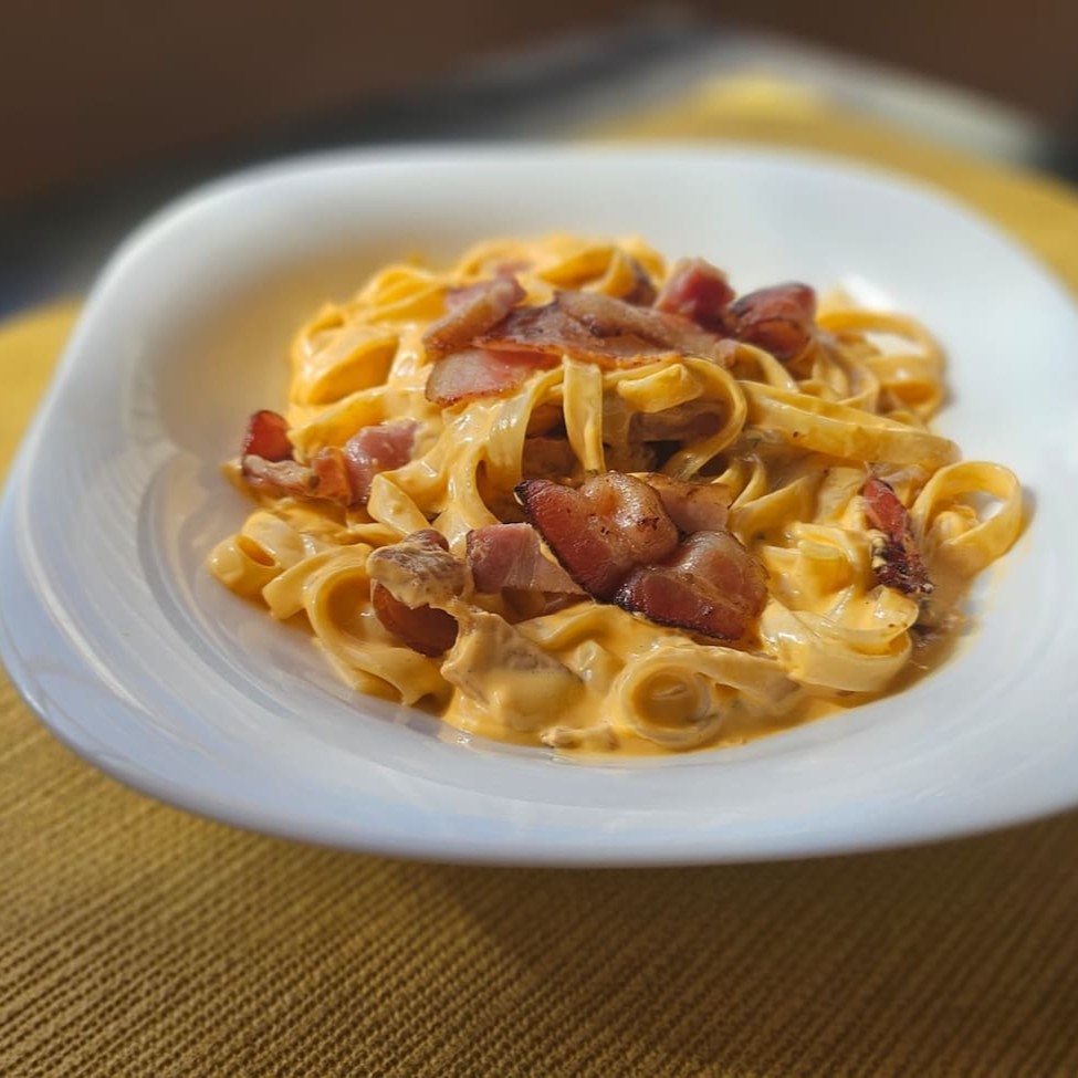 Uma delícia americana com nosso jeitinho. Talharim cozido no ponto certo, com molho cheddar especial e pedaços de bacon pra se deliciar. Rico, cremoso e perfeito para o almoço! Embalagem com 500ml. Serve muito bem uma pessoa.