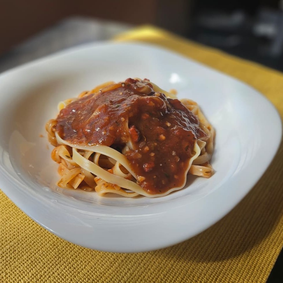 Um clássico italiano. Talharim cozido no ponto certo, com molho delicioso molho sugo! O melhor do tomate e especiarias. Embalagem com 850ml. Serve muito bem duas pessoas.