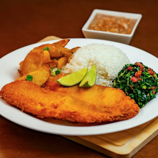 Delicioso filé de tilápia frito empanado com tempero cajun! Acompanha arroz, feijão, batata rústica.