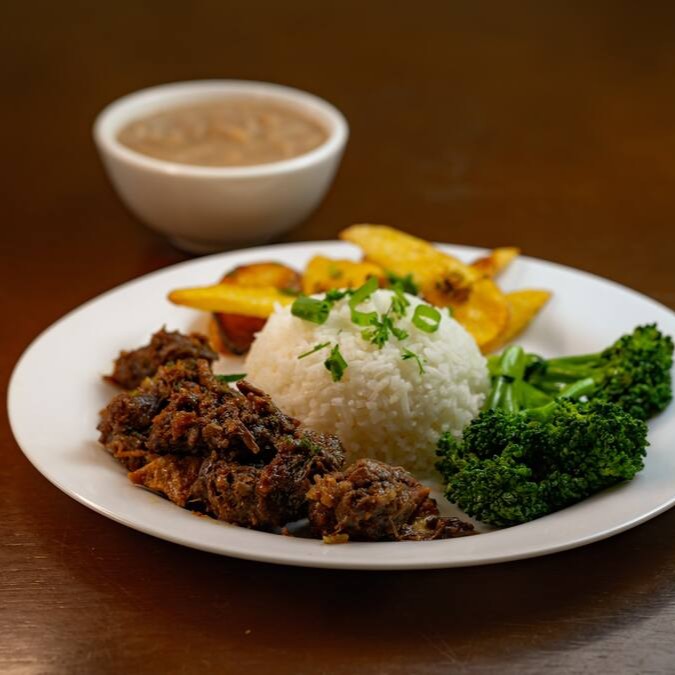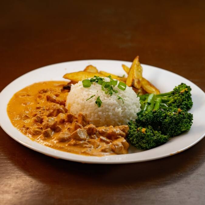 Deliciosa carne de angus em cubos em um molho suculento com alho porró! Acompanha arroz, feijão, batata rústica e refogadoo do Dia.