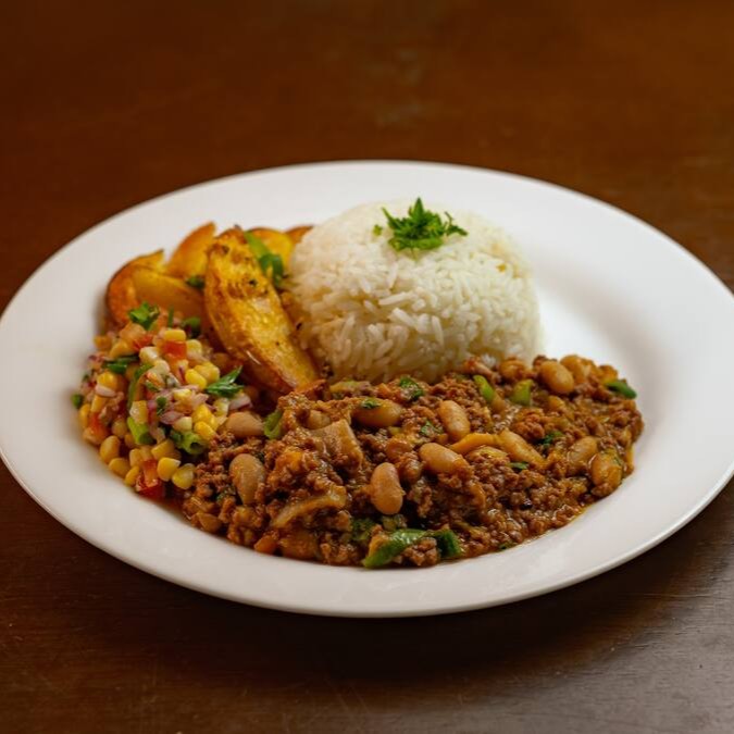 Suculento feijão com carne bovina moída, típico da culinária Texmex, com nosso toque brasileiro, levemente apimentado.