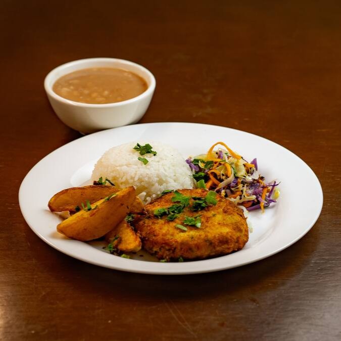 Suculento Hambúrguer vegetariano de legumes com provolone, empanado crocante. Acompanha arroz, feijão, batata rústica e refogado do Dia.