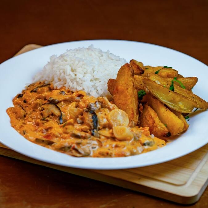 Delicioso Strogonoff cremoso de frango com champignons, acompanha arroz e batata rústica.