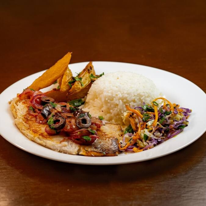 Filé de tilápia grelhada no azeite, com cebola roxa e azeitonas preta! Acompanha arroz, feijão, batata rústicae refogado do Dia.
