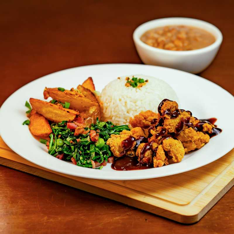 Deliciosos cubinhos de sobrecoxa desossada com tempero especial, frito e crocante! Acompanha arroz, feijão, batata rustica e refogado do dia.