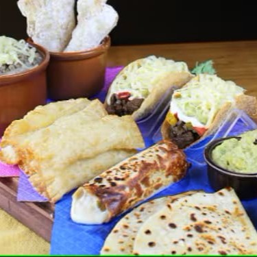 02 deliciosos tacos crocantes, 01 quesadilla de queijos, 04 flautas salgadas, 50gr de nachos, 02 flautas doces de chocolate; Acompanham 04 molhos