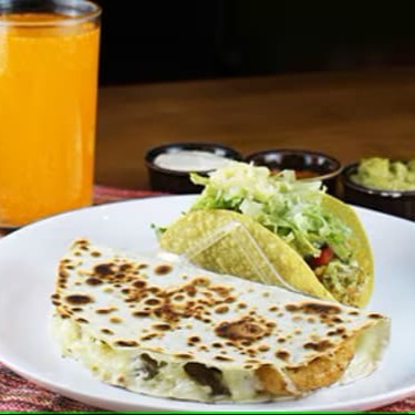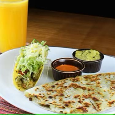 01 quesadilha vegetariana (escarola/ abobrinha/ vegetais) + 01 taco vegetariano + 250 ml suco.