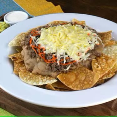 Tortilha de trigo tostada com carnes condimentadas, pico de galo, sour cream, guacamole, alface e queijo.