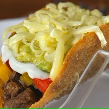 Tortilha de milho em forma de Concha, recheada com grelhados, pico de galo, Sour cream, guacamole, alface e mussarela.