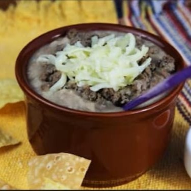 Feijão Refrito com carne , molho de tomate e condimentos.