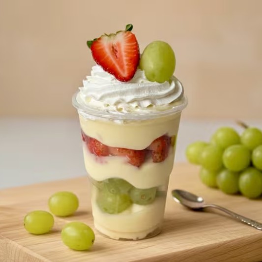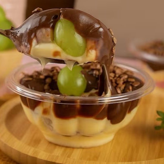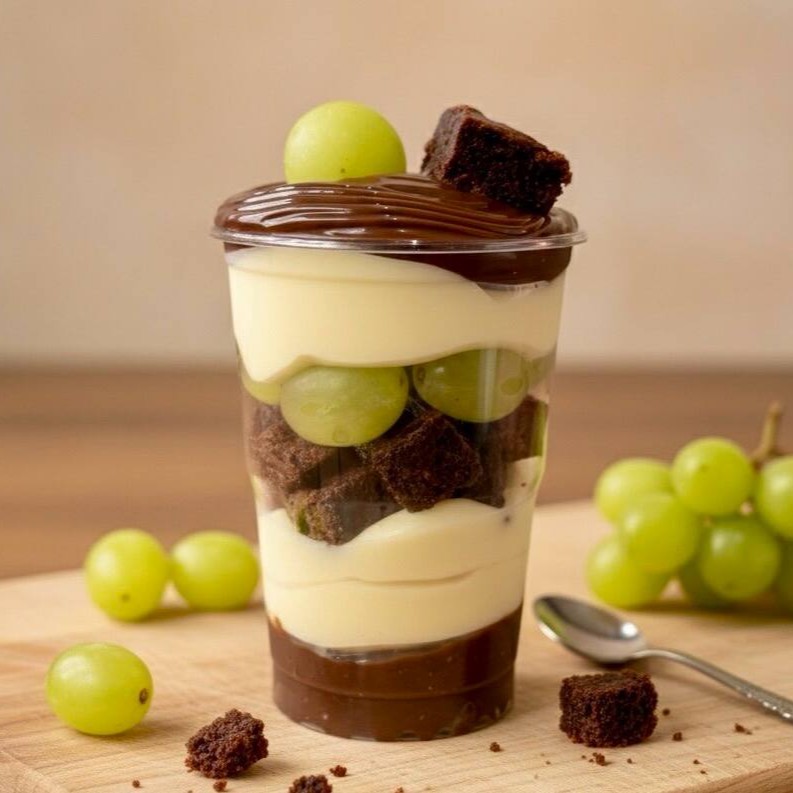 Montado no copo de 250ml - Uma explosão de sabor em cada colherada! Camadas irresistíveis de brigadeiro cremoso de chocolate e brigadeiro de leite Ninho, pedaços generosos de brownie e uvas verdes sem semente! Um copo surpreendente, equilibrando o doce do chocolate com a leveza das uvas.