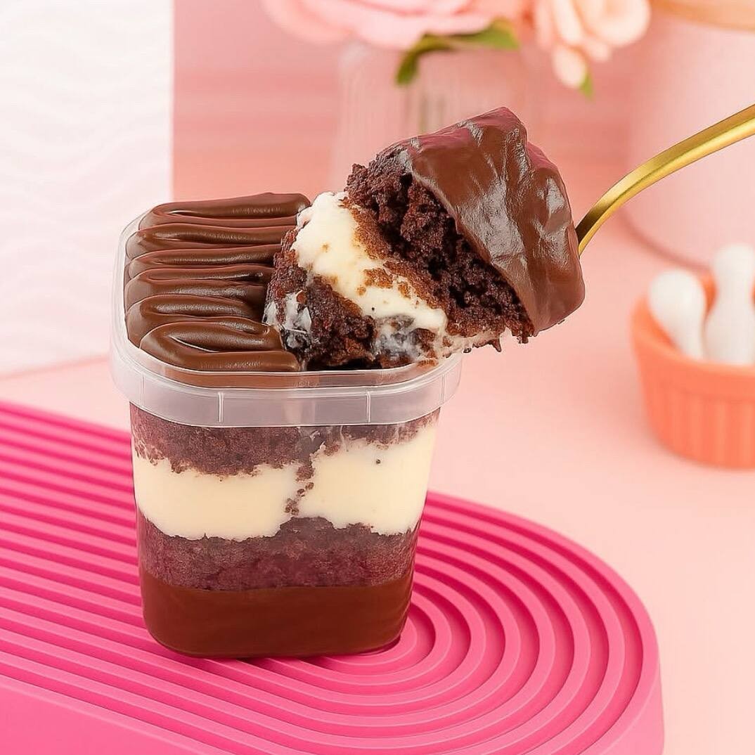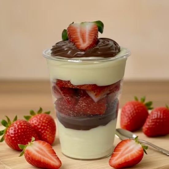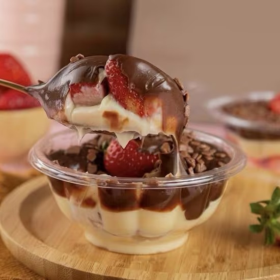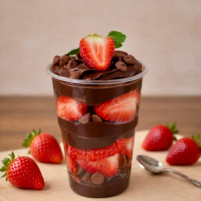 Montado no copo de 250ml -Esse copo contém camadas de brigadeiro cremoso de chocolate, gotas de chocolate e pedaços de morangos frescos. Aquela combinação perfeita de chocolate com morango