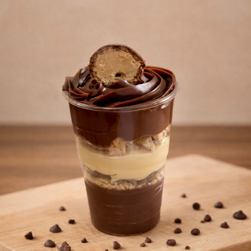 Montado no copo de 250ml - Para os amantes de Sonho de Valsa: Esse copo contém Brigadeiro cremoso de chocolate, amendoim triturado, gotas de chocolate, brigadeiro cremoso de leite Ninho, e pedaços do bombom Sonho de Valsa