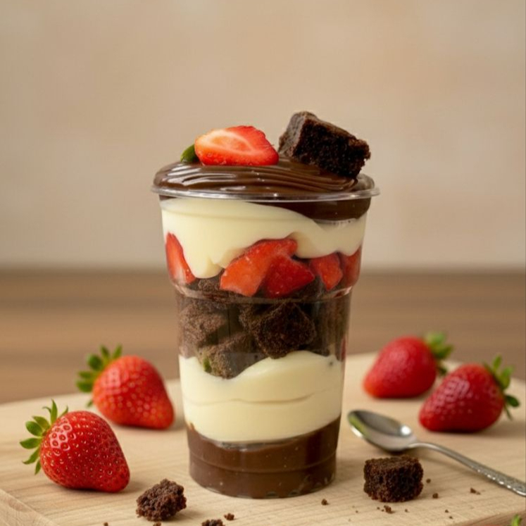 Montado no copo de 250ml - Um irresistível copo recheado de camadas generosas de brigadeiro cremoso de chocolate e brigadeiro de Ninho, combinado com pedaços de brownie macio e morangos fresquinhos. A mistura perfeita entre o doce, o intenso e o leve, para conquistar em cada colherada.
