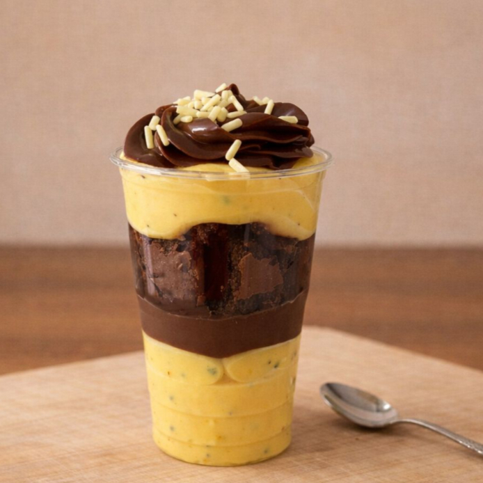 Montado no copo de 250ml - Esse copo contém camadas de brigadeiro cremoso de maracujá, brigadeiro cremoso de chocolate e pedaços de brownie, finalizado com granule de chocolate branco