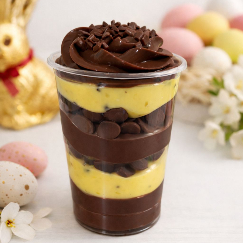 Uma deliciosa versão do ovo de Páscoa servida no copo! Um verdadeiro copo da Felicidade. Camadas de brigadeiro cremoso de chocolate, brigadeiro cremoso de maracujá e chocolate em gotas. Cremoso, equilibrado e perfeito para quem ama chocolate