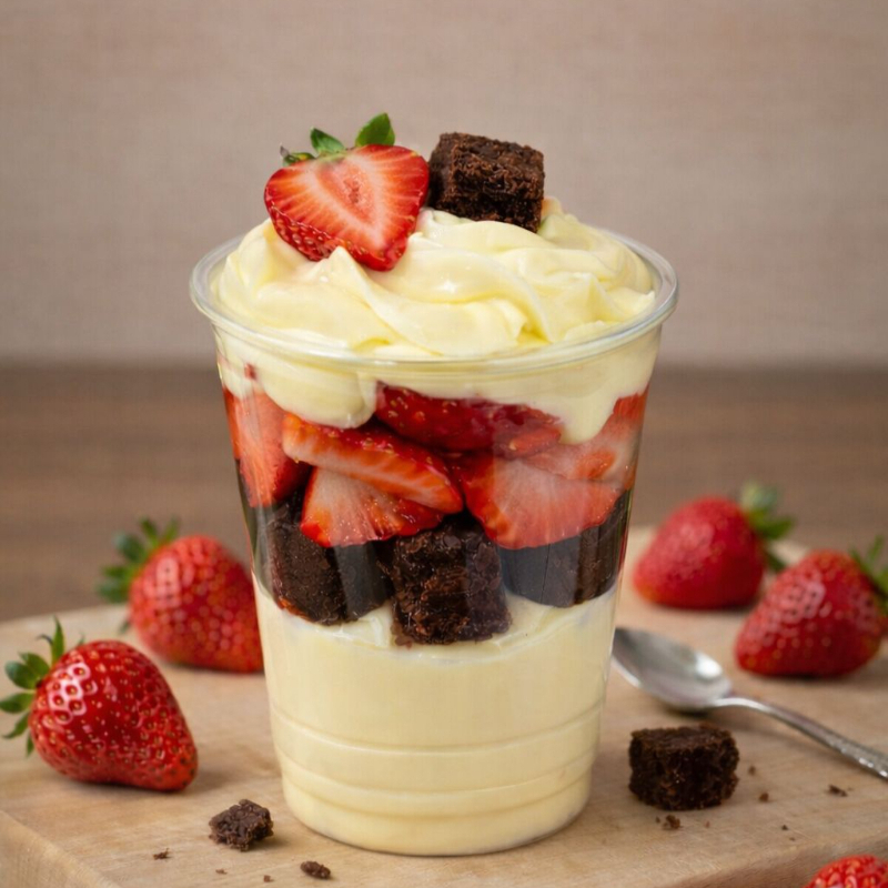 Montado no copo de 250ml - Brigadeiro cremoso de leite ninho, pedaços de brownie e morangos frescos