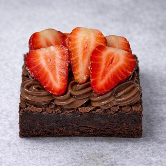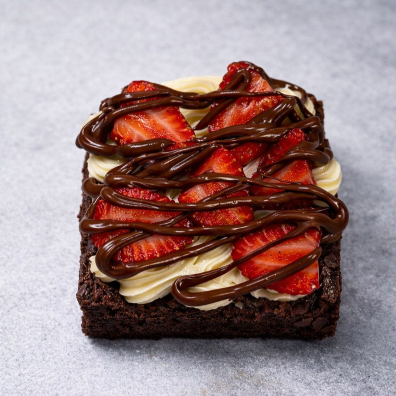 Nosso delicioso pedaço de brownie coberto com brigadeiro tradicional e morangos frescos