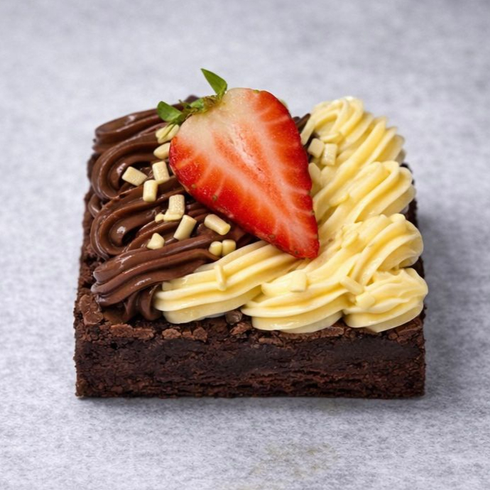 Nosso delicioso pedaço de brownie coberto com metade de brigadeiro de leite Ninho e metade Brigadeiro tradicional, finalizado com granule e Morango fresco