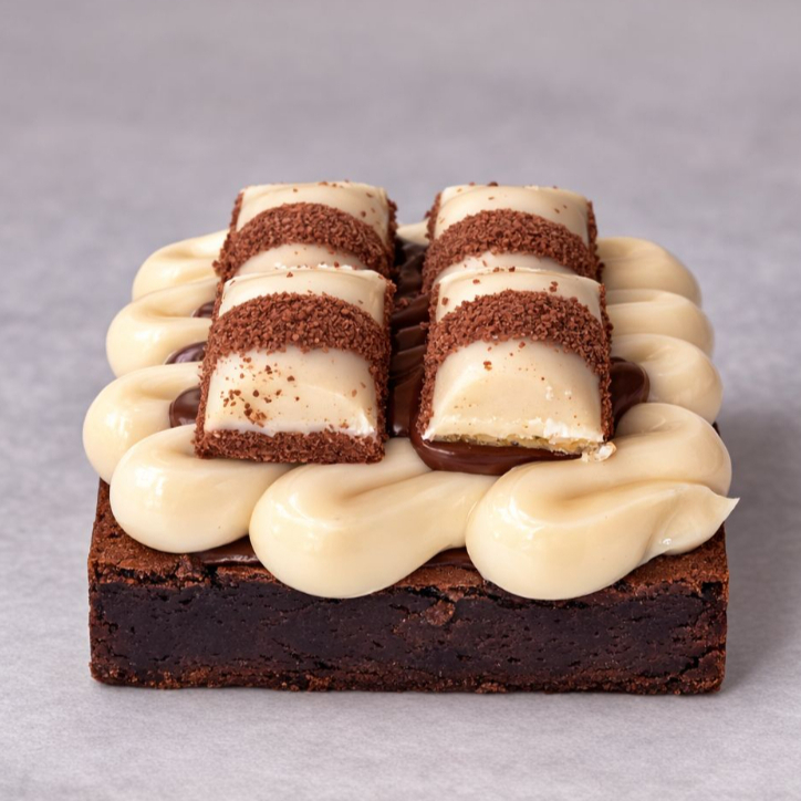 Brownie super chocolatudo, coberto com brigadeiro de leite ninho, nutella e finalizado com pedaços de Kinder Bueno