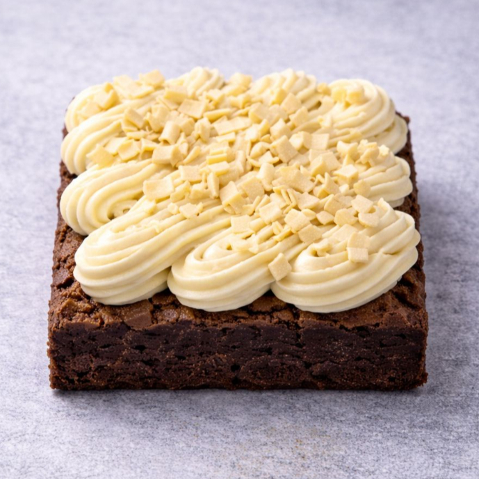 Pedaço de brownie coberto com brigadeiro de leite ninho e finalizado com granule de chocolate branco
