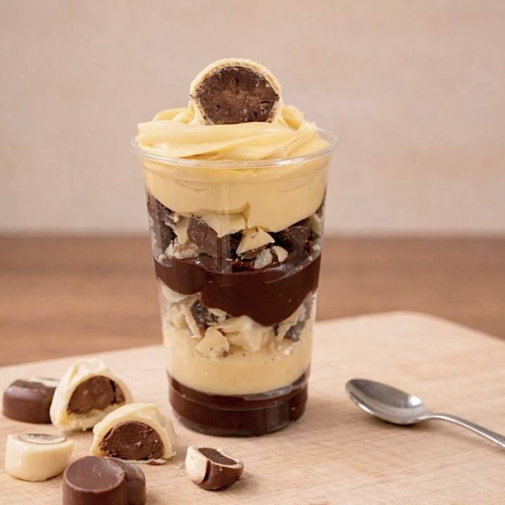 Montado no copo de 250ml - Para os amantes de Ouro Branco: Esse copo contém camadas de Brigadeiro cremoso de chocolate 50%, pedaços de Ouro Branco, brigadeiro cremoso de leite Ninho, finalizado com Ouro Branco