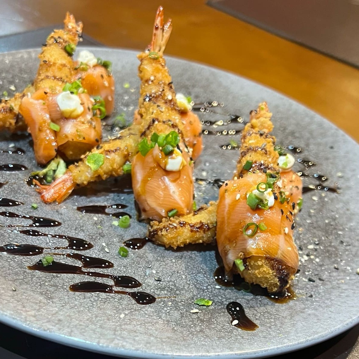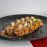 Arroz, Alga ,Salmão Grelhado Empanado E Frito Com Cream Cheese, Doritos, Raspas De Limão, Molho Tare, Gergelim Torrado E Cebolinha (Acompanha 1 Hashi E 3 Sashe De Shoyu)