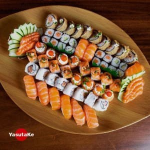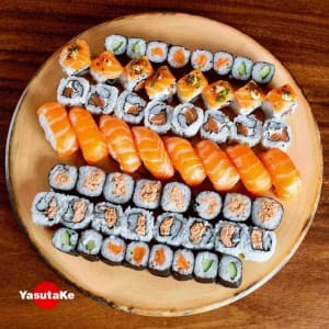 8 Hosomaki Salmão, 8 Kappamaki, 8 Niguiri Salmão, 8 Jyo, 8 Filadélfia, 8 Uramaki Salmão, 12 Sashimi Salmão, 10 Hot Roll (Acompanha 3 Hashi E 8 Sashe De Shoyu)