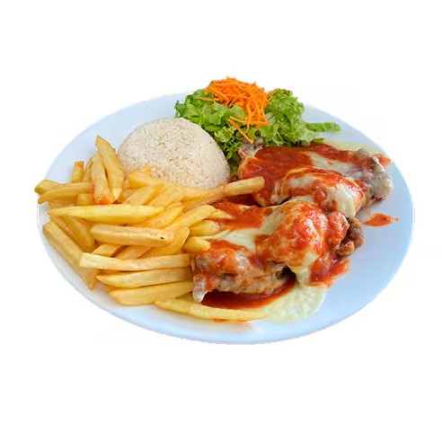 Saboroso Filé de Tilápia à Parmegiana, perfeitamente empanado, coberto com um molho de tomate e finalizado com queijo muçarela derretida, resultando em uma combinação irresistível de sabores. Acompanha batatas fritas, crocantes e douradas, preparadas com o cuidado de quem entende o que é bom. Para completar, um arroz soltinho e bem temperado, e uma refrescante salada de alface com cenoura, fresquinha e crocante. Tudo isso em um Marmitex M, ideal para uma refeição completa e satisfatória.