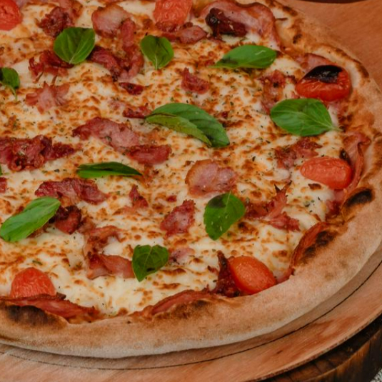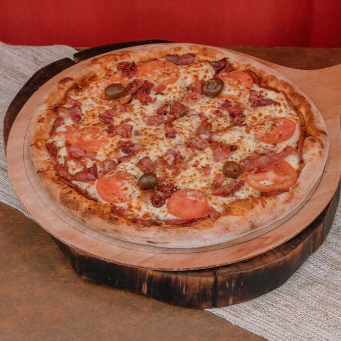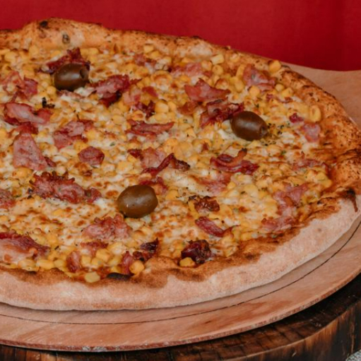 Pizza bacon com milho vai molho de tomate artesanal, queijo mussarela, milho, bacon e parmesão.8 pedaços. (Tags não inclusas: Pizza Piza Pizzaria Pizaria Baby Broto Brotinho Combo Família Para o Dia dos Namorados Mães Pais Natal Pascoa Verão Inverno Refeição completa Massa Artesanal Fermentação Lenta Forno Esfirra Esfiha a Lenha Gourmet Napolitana Receita Italiana Fogazza pizza dobrada frita Fogaça fougasse foccacia Calzone panzerotto)