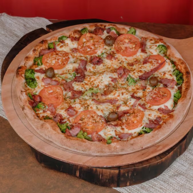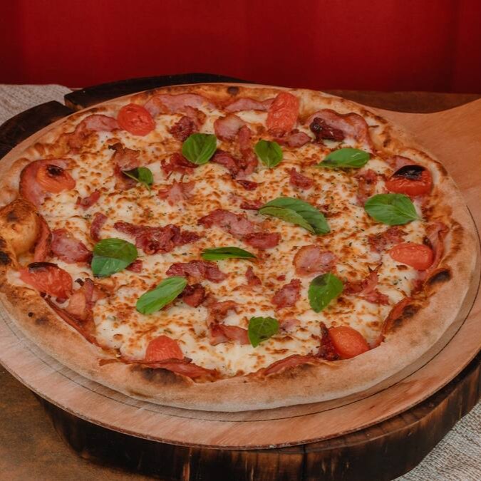 Pizza Troiana vai molho de tomate artesanal, queijo mussarela, lombo canadense, bacon, requeijão, provolone, parmesão, tomate cereja e manjericão , 8 pedaços. (Tags não inclusas: Pizza Piza Pizzaria Pizaria Baby Broto Brotinho Combo Família Para o Dia dos Namorados Mães Pais Natal Pascoa Verão Inverno Refeição completa Massa Artesanal Fermentação Lenta Forno Esfirra Esfiha a Lenha Gourmet Napolitana Receita Italiana Fogazza pizza dobrada frita Fogaça fougasse foccacia Calzone panzerotto)