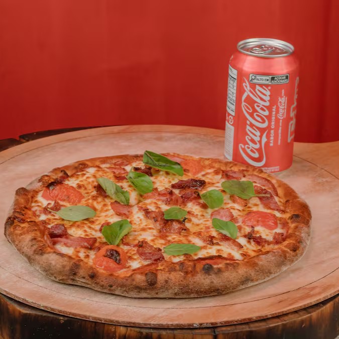 Combo com Pizza broto + 1 coca cola lata Acompanha Orégano e Azeitonas Pretas.