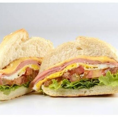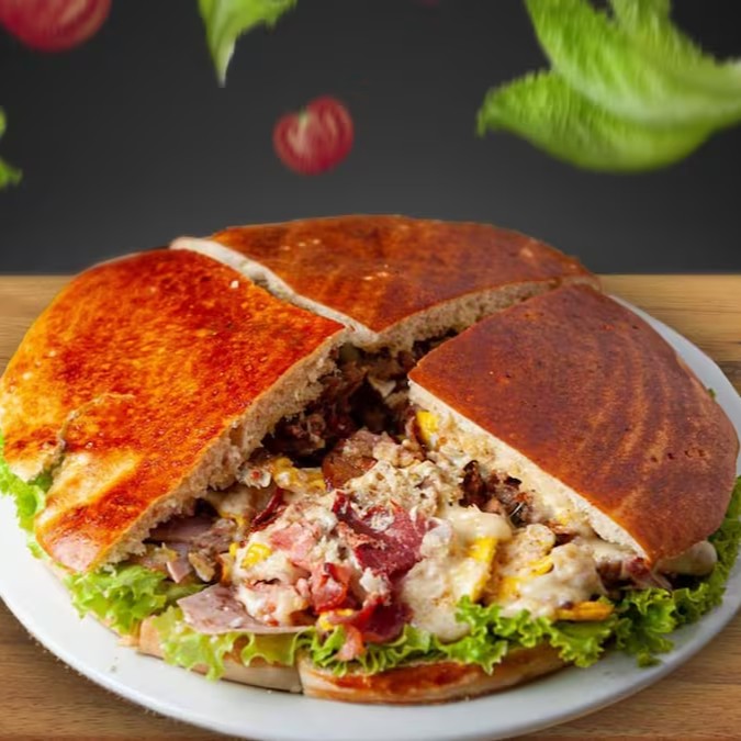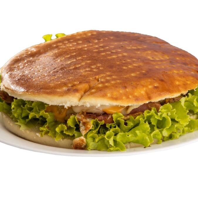 Pão de beirute, bacon frito, ovo, frango desfiado e temperado, Catupiry, presunto, mussarela, alface, tomate e maionese