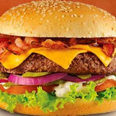 Pão de hambúrguer, hambúrguer, bacon frito, cheddar, mussarela, maionese, alface e tomate