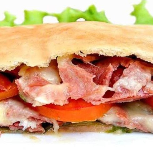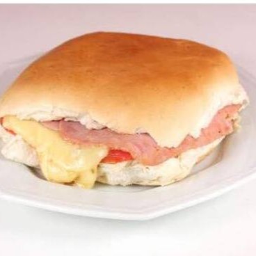 Pão de beirute, bacon frito, ovo, calabresa, Catupiry, presunto, mussarela, alface, tomate e maionese