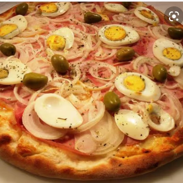 Molho, presunto, cebola, tomate, azeitona, ovo e mussarela