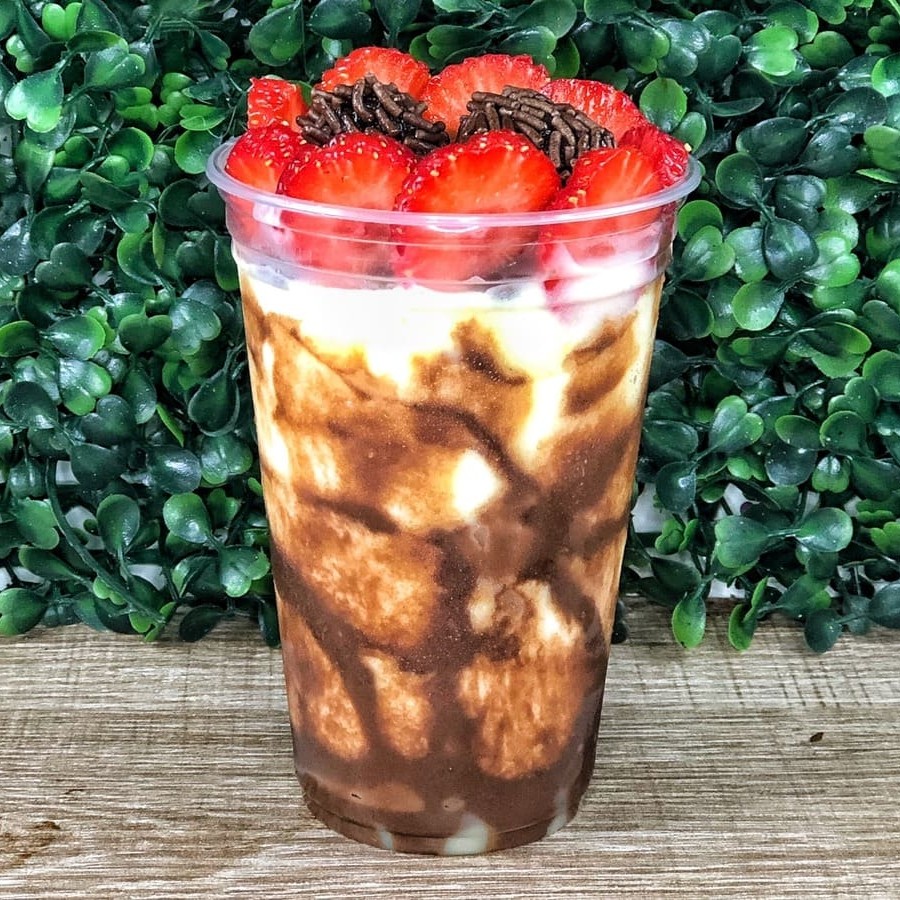 Especial creme de cupuaçu, creme de avelã, brigadeiro, morango, leite em pó E leite condensado. Foto meramente ilustrativa. Copo 330ml!!