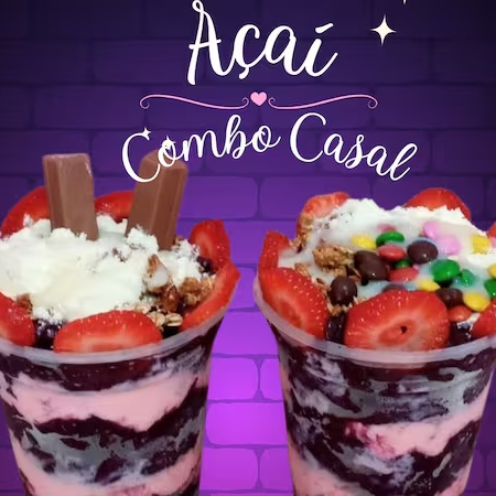 Super Combo Açaí Casal 440ml (Duas Unidades) Refrescante e cheio de sabor! Escolha 4 acompanhamentos grátis, como frutas frescas (morango, banana, entre outras), cremes especiais (Nutella Original, creme de avelã, creme de Ninho), e complementos deliciosos, como paçoca, granola, leite em pó, ou chocolate trufado. Personalize do jeito que você ama e aproveite a excelência em cada colherada!