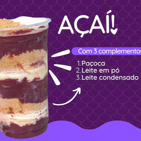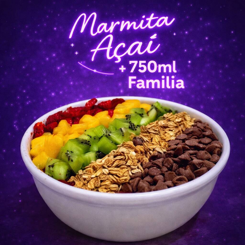 Super Marmita de Açaí Grande (500ml) – Uma experiência de sabor incrível! Prepare-se para uma explosão de sabores em cada colherada. Nosso Super Marmitex de Açaí é cremoso, super recheado e vem com o dobro de recheio nos ingredientes que você escolher+ creme de avelã gratis cremoso Para completar, escolha até 4 acompanhamentos gratuitos e crie a combinação perfeita do seu jeito!