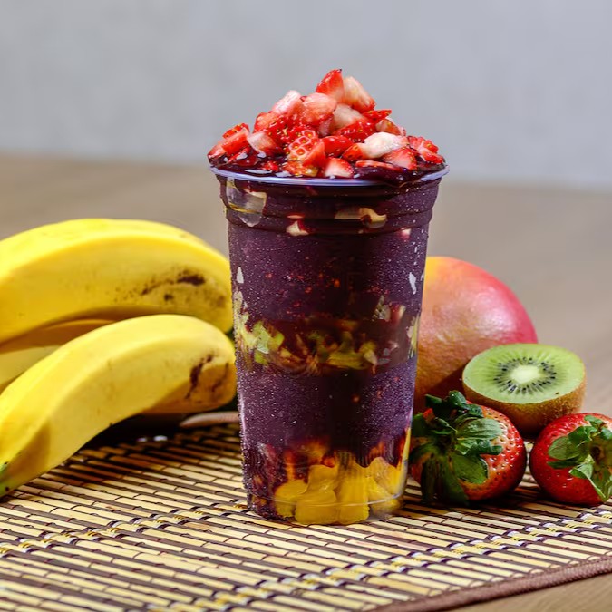 Um delicioso açaí batido com leite, leite em pó e leite condensado. Podendo adicionar morango ou banana!